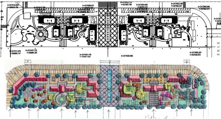在設計地塊中心是一長條形的旱噴景觀,是游園主要的景觀節點,達到吸引人群,增強空間氛圍,是休閑市民進入商場的主要廊道。 地塊兩側分別設置三五處活動節點,為前來游園的人提供開放、半私密、及私密空間,功能上有商業空間、 休閑空間、娛樂空間等,用自由的曲線道路把各個景觀節點有效得聯系起來。