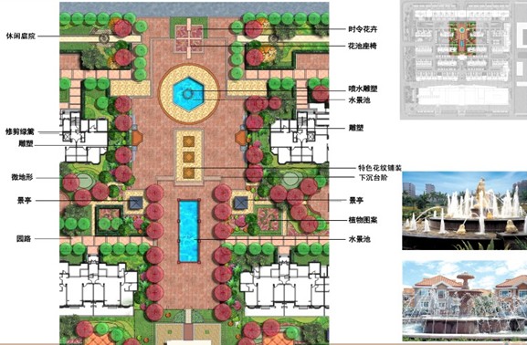 項目考慮“人、自然、空間”之間的和諧關系,堅持以人為本的設計理念,在設計中以生態環境優先為原則,充分考慮建筑和景觀之間的關系,通過材料和造型的運用,將歐式建筑和新古典景觀進行風格樣式上的對接。在規劃的同時,輔以景觀設計,最大限度的體現居住區本身的底蘊。設計中結合當地特色,在小區中設置小區中心景觀軸線、橫向景觀帶、生態種植區等。在中心景觀軸線當中設置了歐式的矮墻噴泉、花溪疊瀑、下層廣場、噴泉水景等,使居民樂居其中。規劃設計注重園林景觀的可參與性,在小區內設置開闊的硬質景觀,如波紋鋪地、琴韻廣場等。小區內公共空間、私密、半私密空間如:下層廣場和健康步道兩者的公共性和私密性設計對比強烈,動靜結合。通過不同的景觀設計,也為小區居民提供空間上充足、多樣的休閑、交往、活動場地,營造和諧、友善、溫馨的人際關系氛圍。